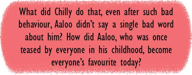 Parsley started up again, “Aaloo, Chilly is a horrible best friend. You need to find a new best friend. Look at what he is doing just because he lost once! I’m placing an advert in the newspaper for a best friend - do you want to place one too?” Suddenly Parsley lit up as if a brilliant idea had just popped into his head. He came close to me, fluttering his eyes, and started speaking in a sweet tone, “Dear… Brother Aaloo… Let's do one thing: you and I should become best friends.”