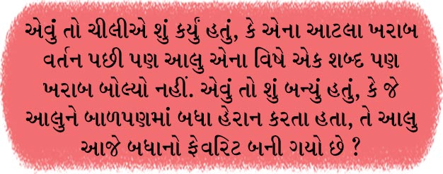 હજુ હું કોઈને કંઈ કહું એ પહેલા કોકો બોલી, ’સોરી આલુ, હું જયાં જઉં છું ત્યાં બધું ખોટું જ થાય છે !’ અને પછી એ પણ રડતી રડતી જતી રહી. પાર્સલીએ ફરી બોલવાનું ચાલુ કર્યું, ’આલુભાઈ, આ ચીલી બહુ ખરાબ બેસ્ટ ફ્રેન્ડ છે. તમે નવો બેસ્ટ ફ્રેન્ડ બનાવી લો. એકવાર હારી ગયો એમાં તો કેવું કરે છે ! હું મારા બેસ્ટ ફ્રેન્ડ માટે છાપાં (ન્યુઝ પેપર) માં એડ મૂકવાનો છું, તમારે પણ મૂકવી છે ?’ અને ત્યાં જ એના દિમાગમાં કોઈ જબરજસ્ત આઈડિયા આવ્યો અને એ મારી આજુબાજુ આવીને, આંખો પટપટાવીને, કાલુ-કાલુ બોલવા માંડયો, ‘આ...લુ...ભા...ઈ..., એક કામ કરીએ, તમે ને હું બેસ્ટ ફ્રેન્ડ્સ બની જઈએ.’