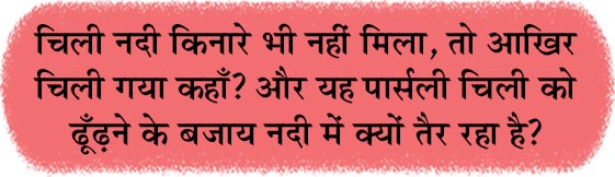 देखा तो पार्सली नदी में तैर रहा था। पार्सली को देखकर पहली बार मुझे गुस्सा आ गया। मैंने उसे गुस्से से पूछा, ‘पार्सली, तुम चिली को ढूँढ़ने के बजाय यह क्या कर रहे हो?’