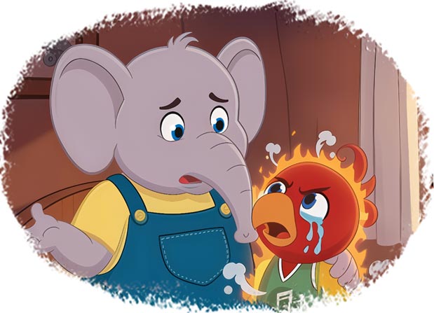 Now he was becoming red with anger, “That Koko… I don’t know what she thinks of herself! She has no skill. I think that she must’ve buttered up the judge! And why were you cheering, ‘Koko, Koko’? I’m your best friend! How could you tell Koko that she’d win? Saying this, he poked me hard with his beak. “Ahhhh…..!” Before I could say anything, he started pacing back and forth around the room and said, “Aaloo, again I feel hot. What is happening to me? My feathers are burning up. Aaloo, please do something to stop this!”