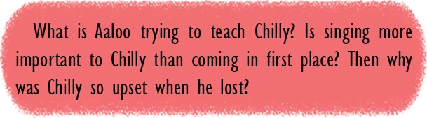 Aaloo became very serious and said, “So, Chilly, how could you forget something so simple? You enjoy singing, not winning. You’re happy whenever you’re singing, whether you’re with me or on your own, whether you’re flying or drinking a Chilly Shake, whether you’re taking part in a singing competition or not - you just love to sing. You don’t sing because you want to be the best singer; you sing because it makes you happy! If you wanted to be the best at something, then you could’ve chosen skating, dancing, or anything else. But you chose singing - because you love it.”