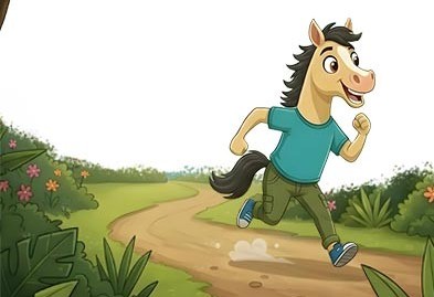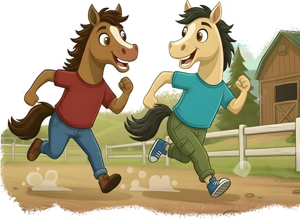 Aaloo shook his head and said, “No, Chilly, except for me, no one knows the real secret. Let me tell you. When Taco went to the city, he joined the racecourse and began practicing really hard. During his training, he met Browny, another horse, and they became best friends. They stayed together all the time and would often joke with each other. ‘Just watch, it will be me that wins the race!’ they would say to each other."